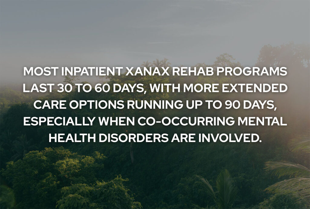 Most inpatient Xanax rehab programs last 30 to 60 days, with more extended care options running up to 90 days, especially when co-occurring mental health disorders are involved. Outpatient programs typically last between 8 to 16 weeks, depending on the person’s progress and support needs.